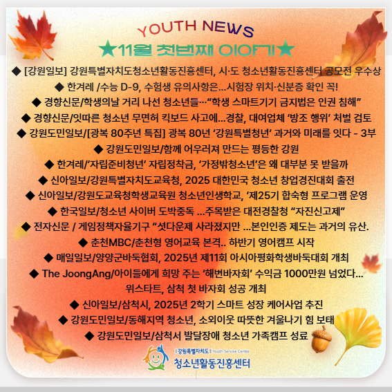 | 제목 | ★11월 첫 번째 Youth News★ | ||||