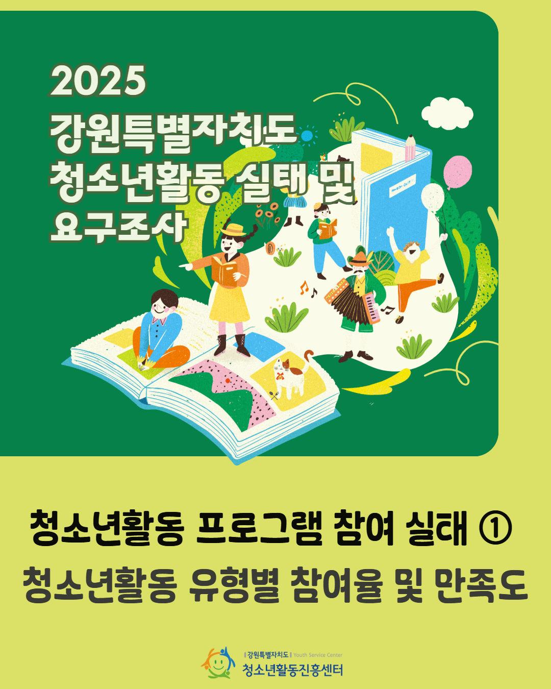 | 제목 | 2025년 강원특별자치도 청소년활동 실태 및 요구조사 - ① 청소년활동 유형별 참여율 및 만족도 | ||||
