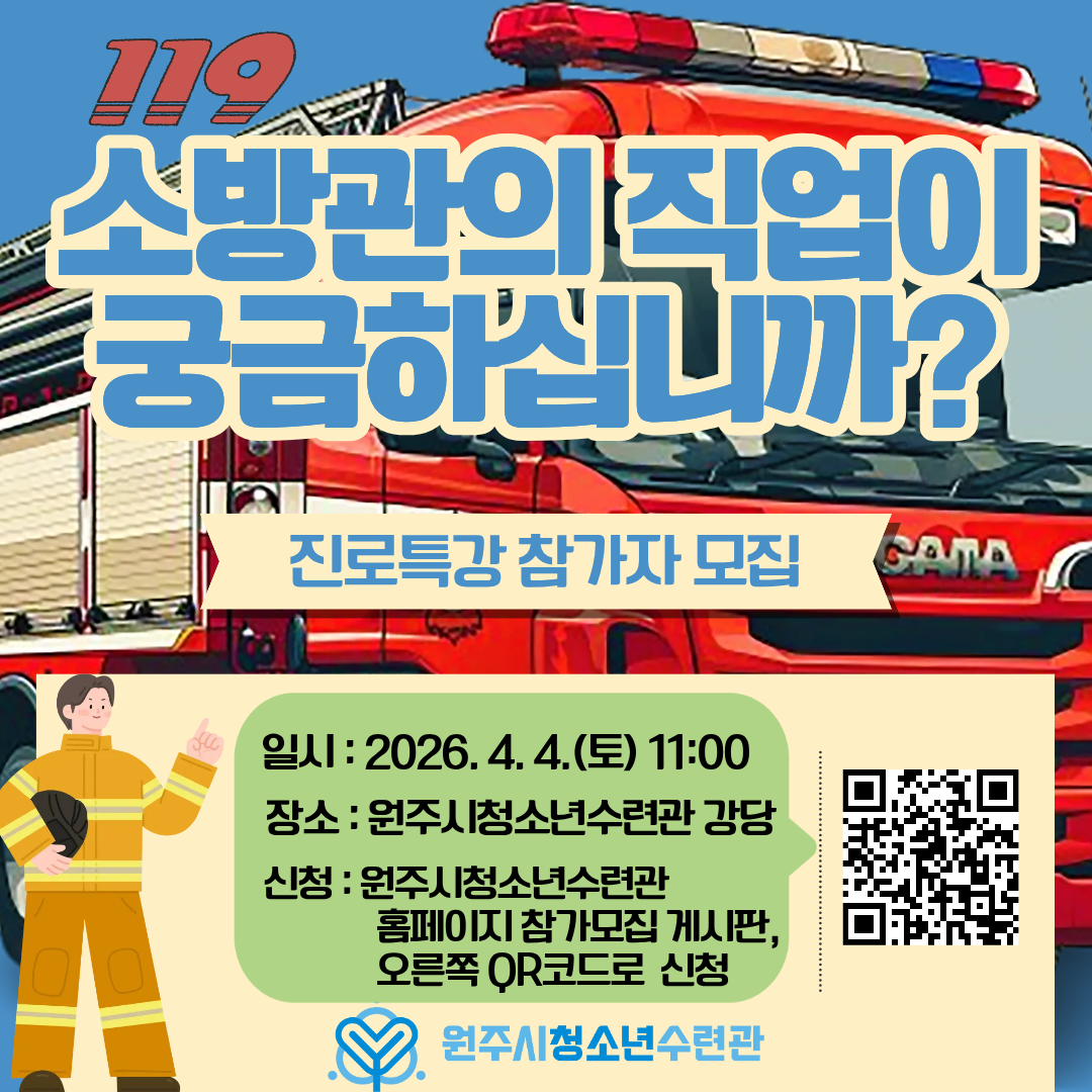 | 제목 | [모집홍보]원주시청소년수련관 진로특강 '소방관의 직업이 궁금하십니까?' 참가자 모집 | ||||
