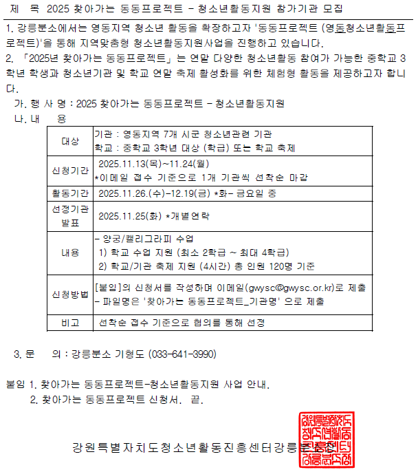 2025 찾아가는 동동프로젝트 - 청소년활동지원 참가기관 모집