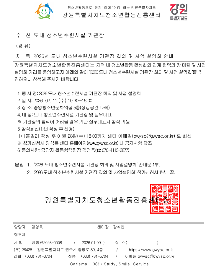 260109_[붙임1,2] 도 내 청소년수련시설 기관장 회의 안내 건.hwp