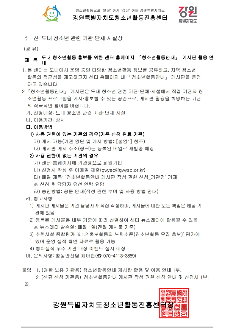 [공문] 도내 청소년활동 홍보를 위한 센터 홈페이지 「청소년활동안내」 게시판 활용 안내.pdf