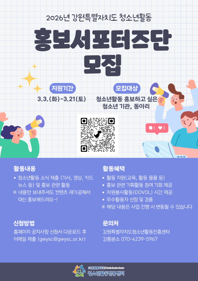 사. 문 의: 강원특별자치도청소년활동진흥센터 강릉분소 하은주(☎070-4239-5967)