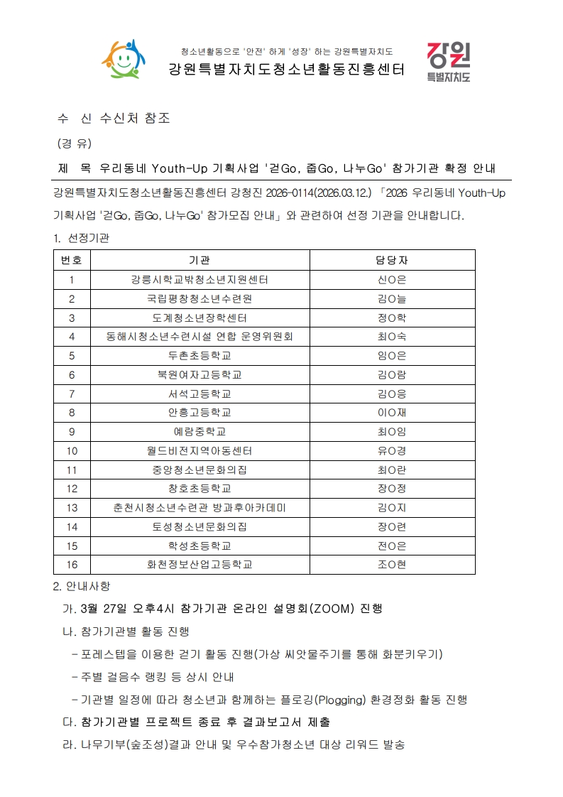 [공문]우리동네 Youth Up 기획사업 '걷Go, 줍Go, 나누Go' 참가기관 확정 안내.pdf
