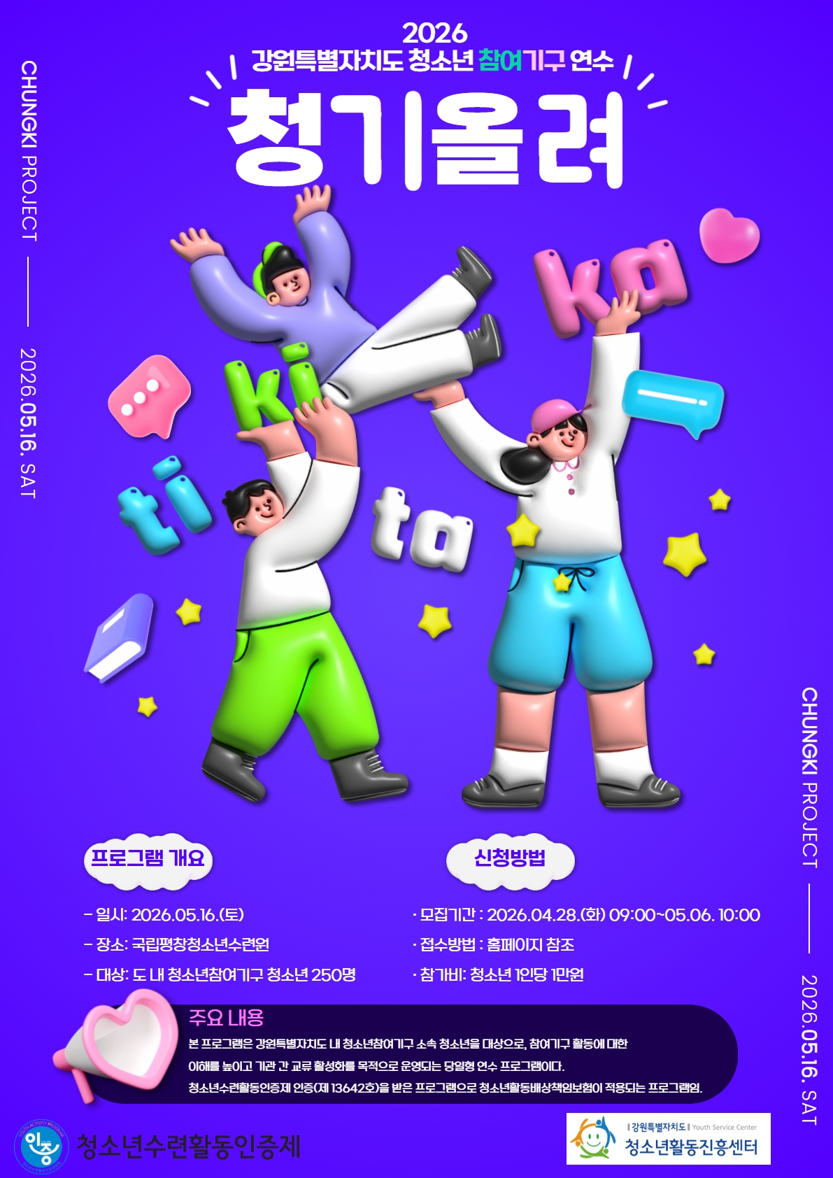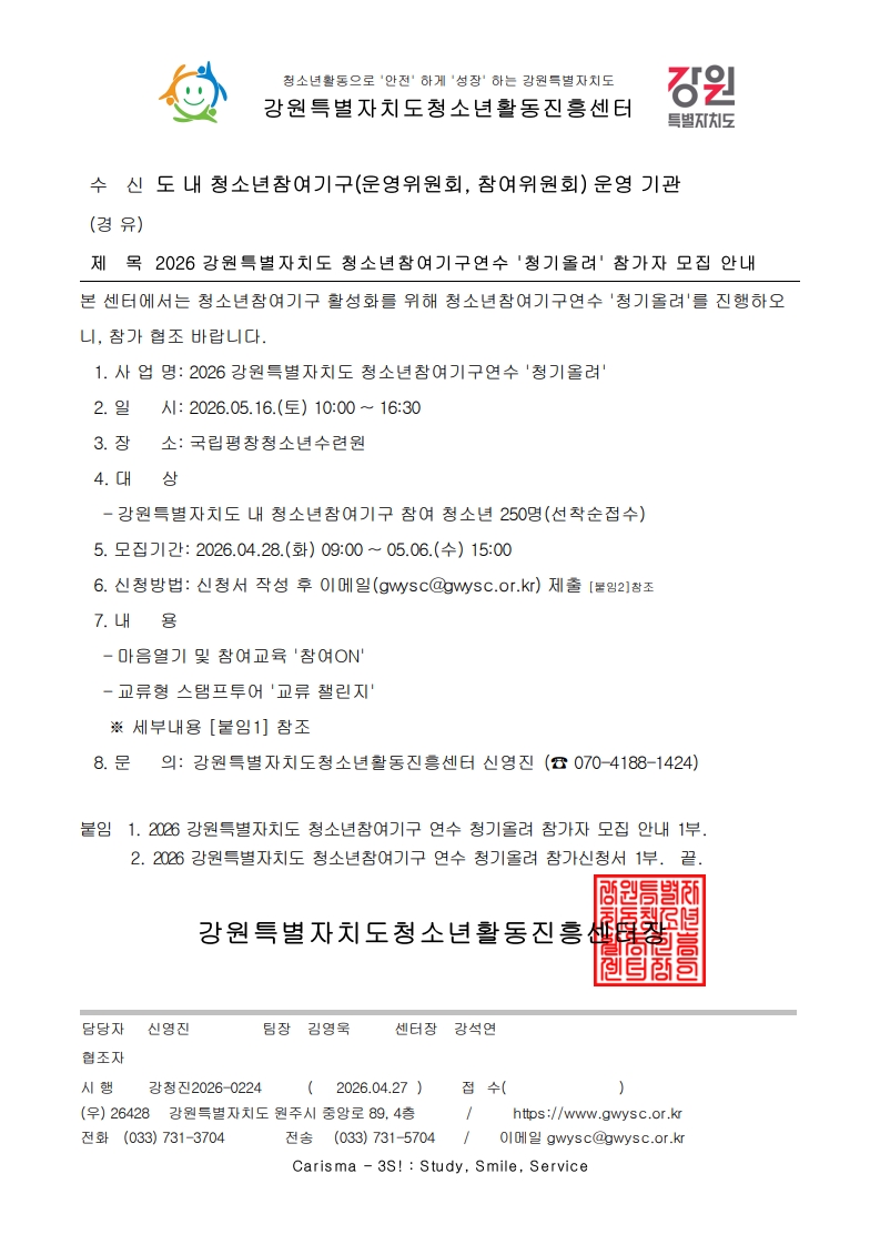 | 제목 | 2026 강원특별자치도 청소년참여기구연수 '청기올려' 참가자 모집 안내 | ||||