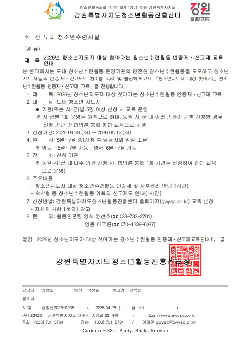 2026년 청소년지도자 대상 청소년수련활동 인증제 신고제 교육 안내