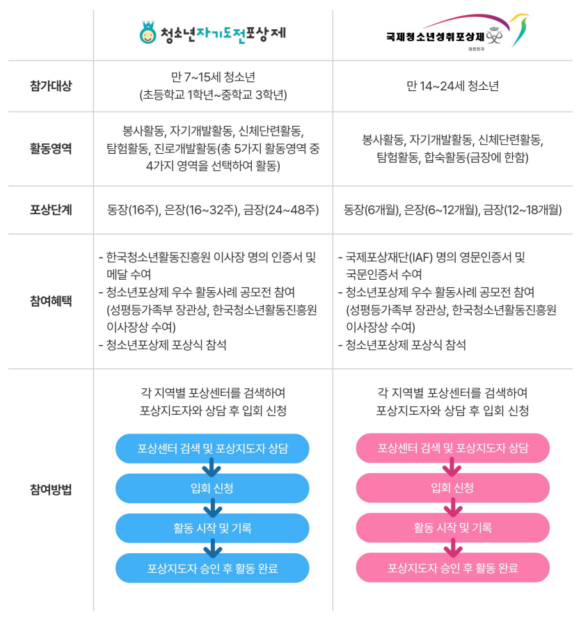 청소년포상제는 자기주도적인 활동을 통해 청소년들이 자신의 잠재력을 발견하고, 실제 생활에 필요한 기술을 배울 수 있는 프로그램입니다. 국제청소년성취포상제(만 14~24세 대상)와 청소년자기도전포상제(만 7~15세 대상)로 나뉘며, 참가 청소년들은 다양한 활동영역에서 일주일에 1번씩 꾸준히 도전하여 본인이 설정한 목표를 성취하면 포상인증서를 수여 받을 수 있습니다. 강원특별자치도청소년활동진흥센터가 도 포상운영사무국을 맡아 연합 탐험활동, 포상식 등을 운영 및 지원하고 있습니다.